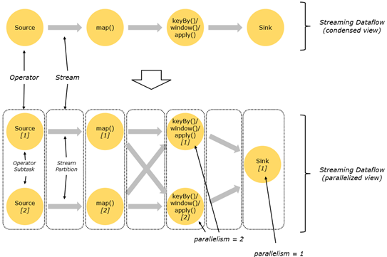 - 在大部分情况下,程序中的转换运算(transformations)跟dataflow中的算子(operator)是一一对应的关系